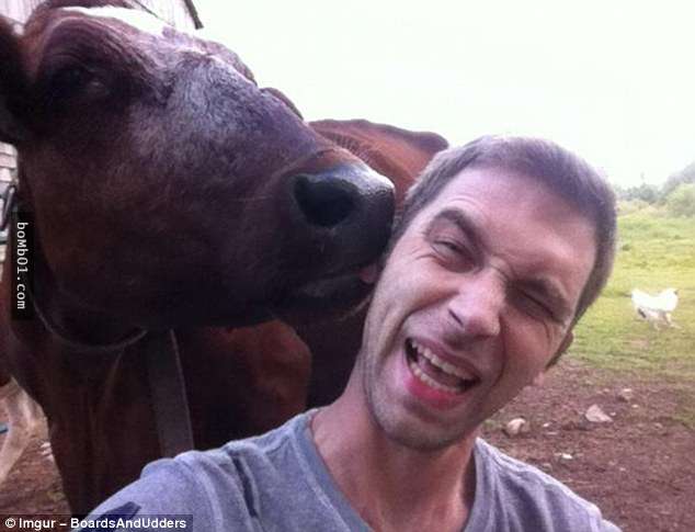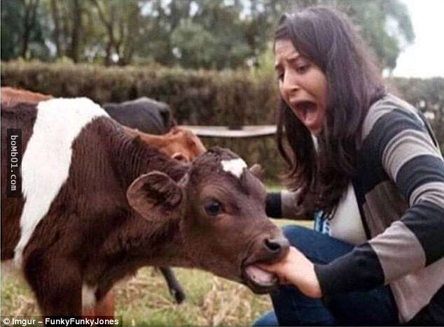 ▼牛給了他一個深情的吻,他似乎不覺得開心。