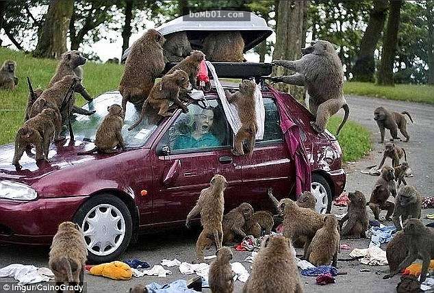 ▼這就是把行李箱放在車頂的下場,狒狒們比想像中要厲害得多。