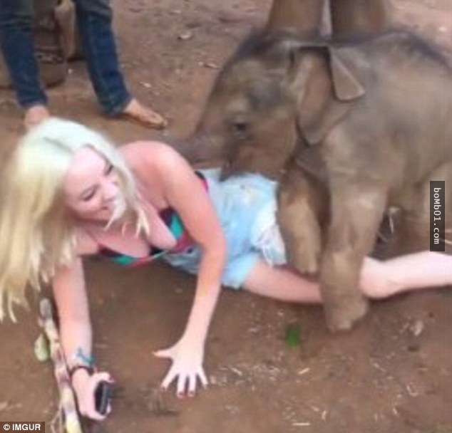 ▼小象直接撲倒遊客玩耍,幸好牠體型小,否則就麻煩了。