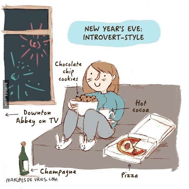 ▼11.跨年夜的標配:巧克力餅乾、熱可可、披薩、香檳、電視劇。