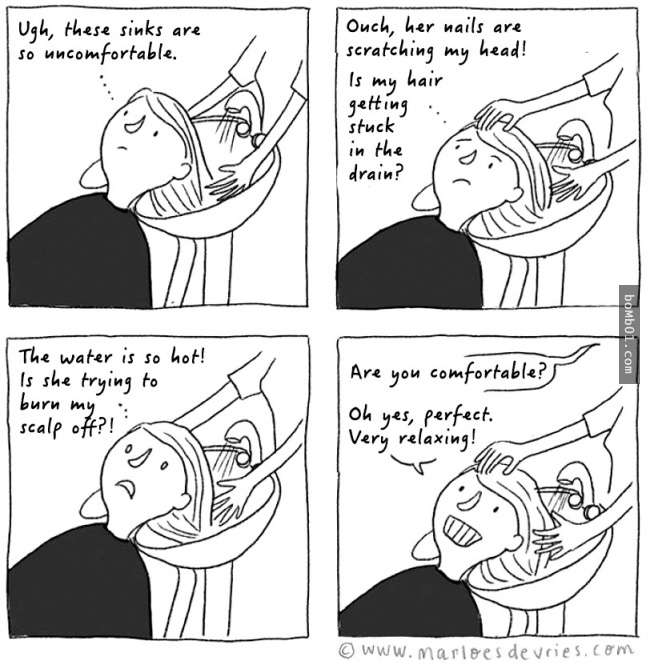 ▼15.洗頭時:這個水槽不舒服。天哪,她的指甲刮到我的頭皮了,我的頭髮卡在出水口了嗎?水好燙啊,她要把我的頭皮燙下來嗎?!