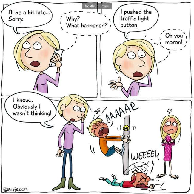 「我按了交通燈按鈕。」「喔!你個笨蛋!」