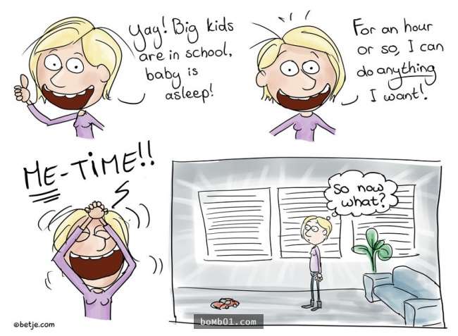 ▼8.「大孩子們去學校了,小寶寶還在睡覺!這一個小時可以做任何我想做的事!這是屬於我的時光!但是……做什麼呢?」