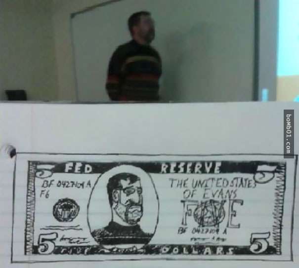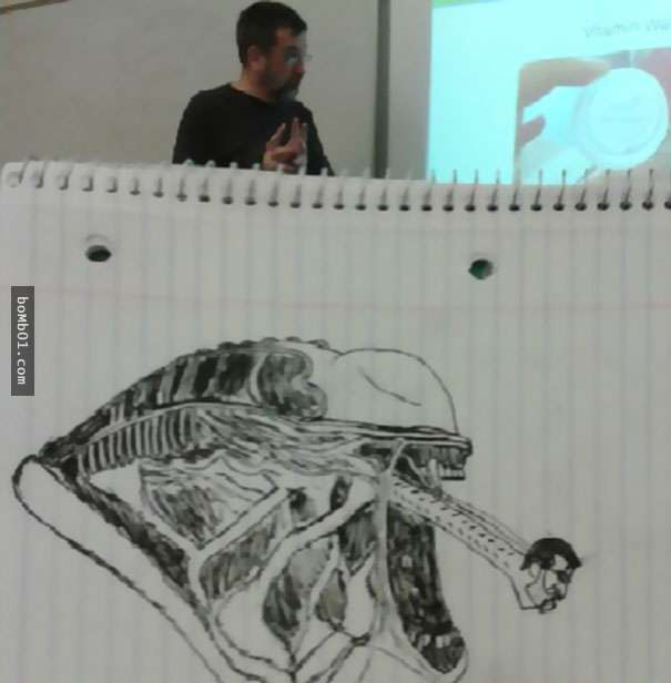 2017年03月08日每個人打發時間的方式都不一樣。有人會小睡片刻,有人會玩手機,下面這名網友則喜歡塗鴉。他感覺商業管理課的教授講課太枯燥,所以發揮想像,讓他成為了塗鴉的主角。