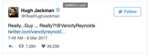 ▼Hugh Jackman立刻回應,不過他的嘴砲技能比不上「死侍」,只能無奈說:「你這傢伙…竟然…」