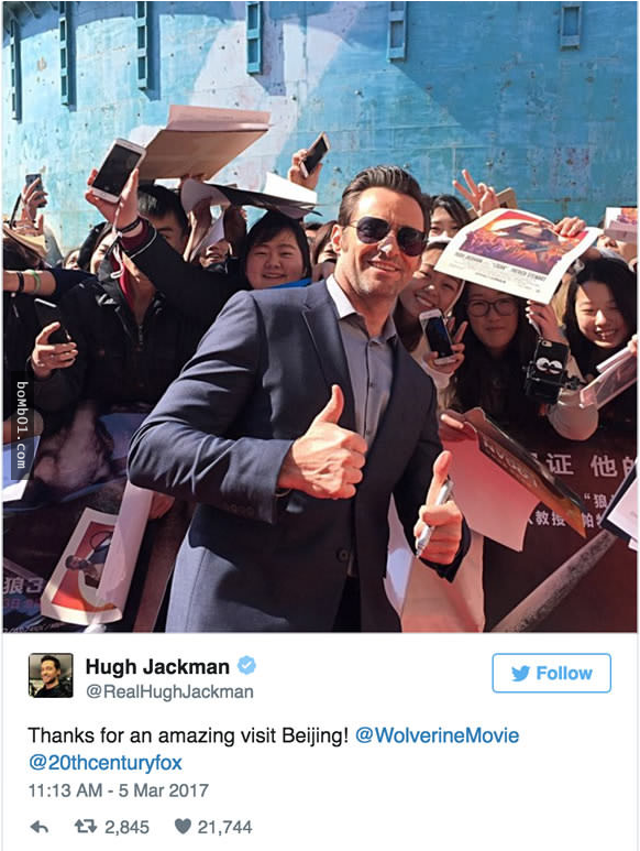 2017年03月11日對喜歡金鋼狼的人來說,《羅根》是一部不得不看的電影。最近,Hugh Jackman到北京宣傳獲得熱烈迴響,他還在社群網站分享了首映會的照片,沒想到竟然引來老朋友「死侍」Ryan Reynolds的調侃。