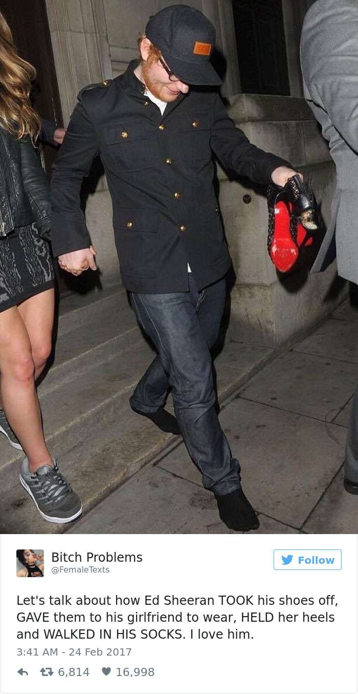 ▼1.「讓我們來談談Ed Sheeran把他的鞋子脫下來,給他的女朋友穿這件事,他幫忙拿女友的鞋子,自己只穿著襪子走路。我愛死他了。」