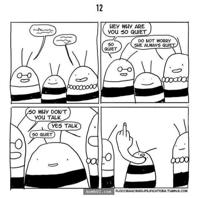 ▼12.「你為什麼總是這麼安靜?」「沒關係啦,她一直以來都這麼安靜。」「妳好安靜喔」「妳為什麼不說話?」