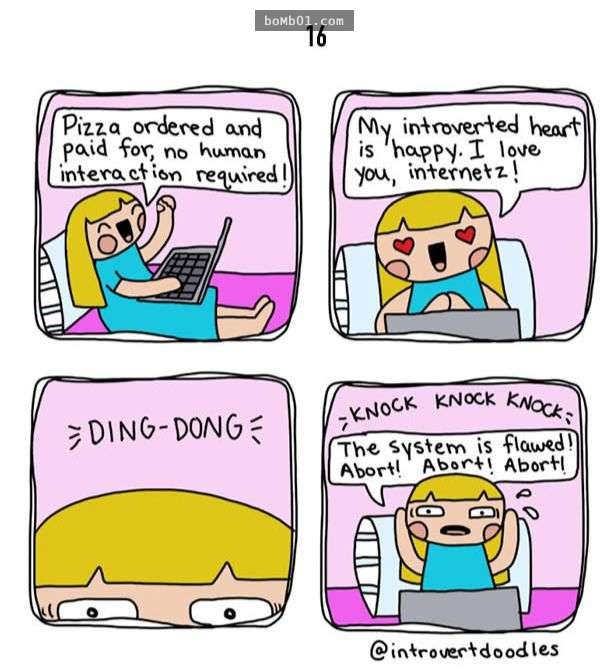 ▼16.「點好披薩也付好錢了!完全不需要跟人互動!」「我內向的心超幸福,我愛網路!」(門鈴響起…)「系統錯誤,無法動作!x3」