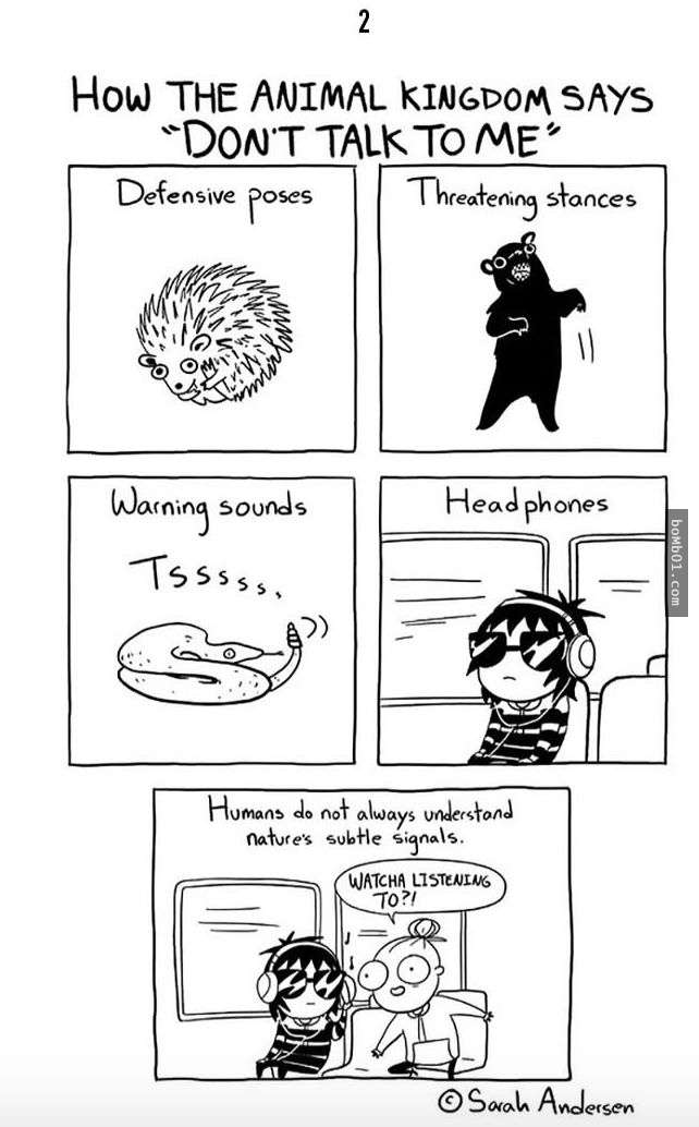 ▼2.動物們表達「別跟我說話」的方式。刺蝟:「防禦性姿勢」、熊:「威脅性的站姿」、蛇:「警告的嘶嘶聲」、人:戴耳機。然而人們卻不總能理解戴耳機的意義。路人:「你在聽什麼啊?」