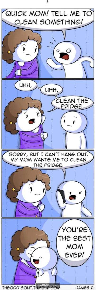 ▼4.小孩:「媽媽,快叫我去清理東西啊!」媽媽:「呃…去清冰箱」小孩:「抱歉,我不能出門,我媽叫我去清冰箱。」小孩:「你是最棒的媽媽!」