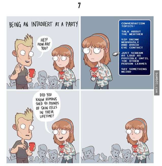 ▼7.內向的人參加派對的時候。男子:「嗨!你好嗎?」內向女子:「*內心冒出千萬個選擇* 你知道人的一生中會褪下超過18公斤的皮屑嗎?」