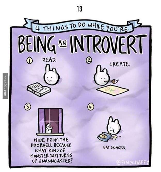 ▼13.內向的人必做的4件事:讀書、創作、不理會門鈴(因為誰會不事先通知就出現?)、吃零食。