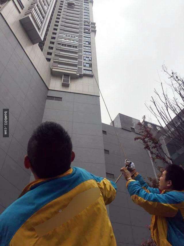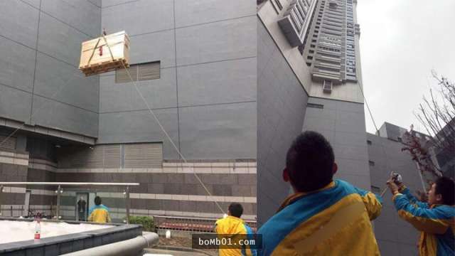 ▼面對這樣的情況,大家都傻眼了。經過研究,他們決定用鋼索、吊籃將電視固定住,然後從室外將它搬上23樓。