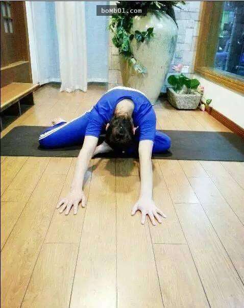 做法:兩腿向兩側打開,雙手體前撐地,仰頭吸氣,呼氣,身向前傾,腹部內收,腰背拱起,前額觸地,眼睛看向肚臍方向。