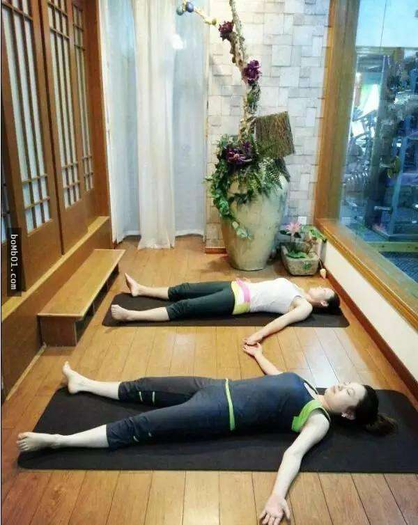 做法:仰卧在墊子上,腹部內收,腰背貼地,雙膝分開,腳尖朝外,雙手攤放在身體兩側,掌心朝上,微閉雙目,平緩呼吸。