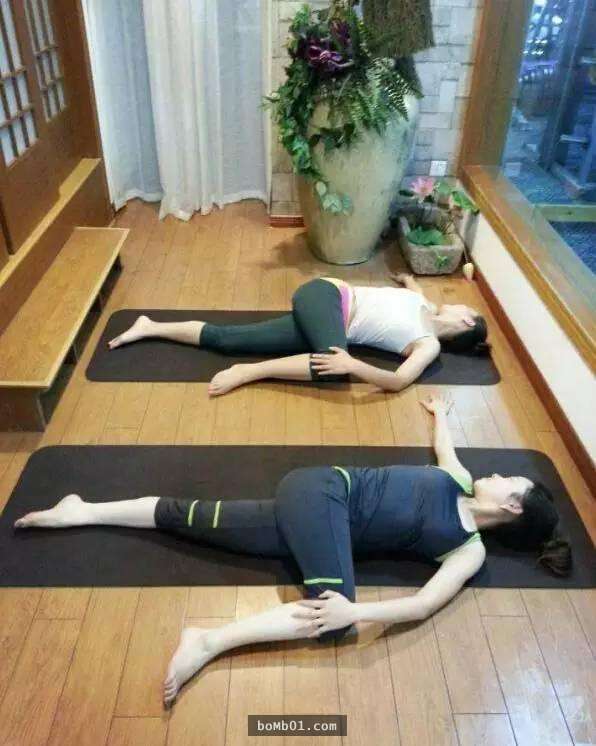 功效:放鬆髖關節,減輕背部壓力,緩解下背部的疼痛;拉伸大腿外側,擠壓大腿內側,刺激肝經,腎經,膽經。