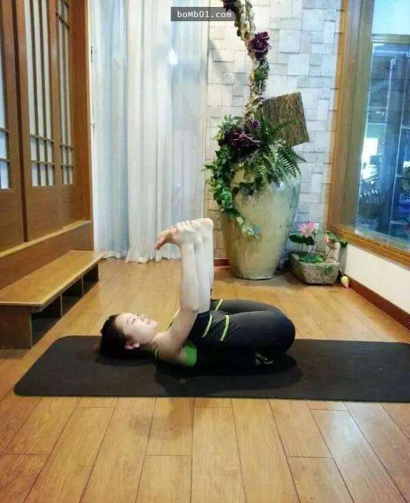 做法:屈雙膝,吸氣,抬起雙小腿,雙手抓住兩腳內側,呼氣,雙肩用力將雙腿向下拉至自己的極限,在此維持3分鐘。