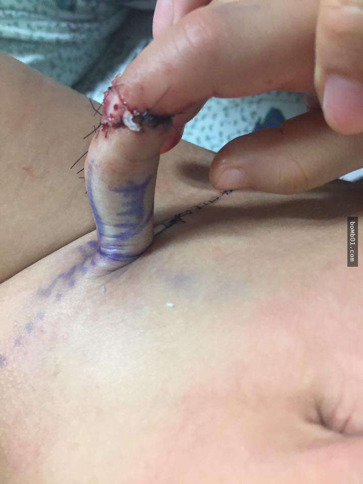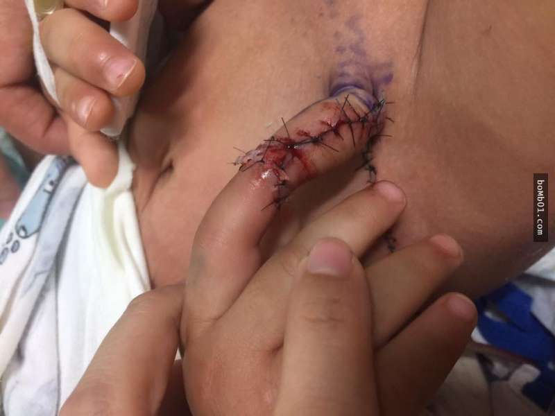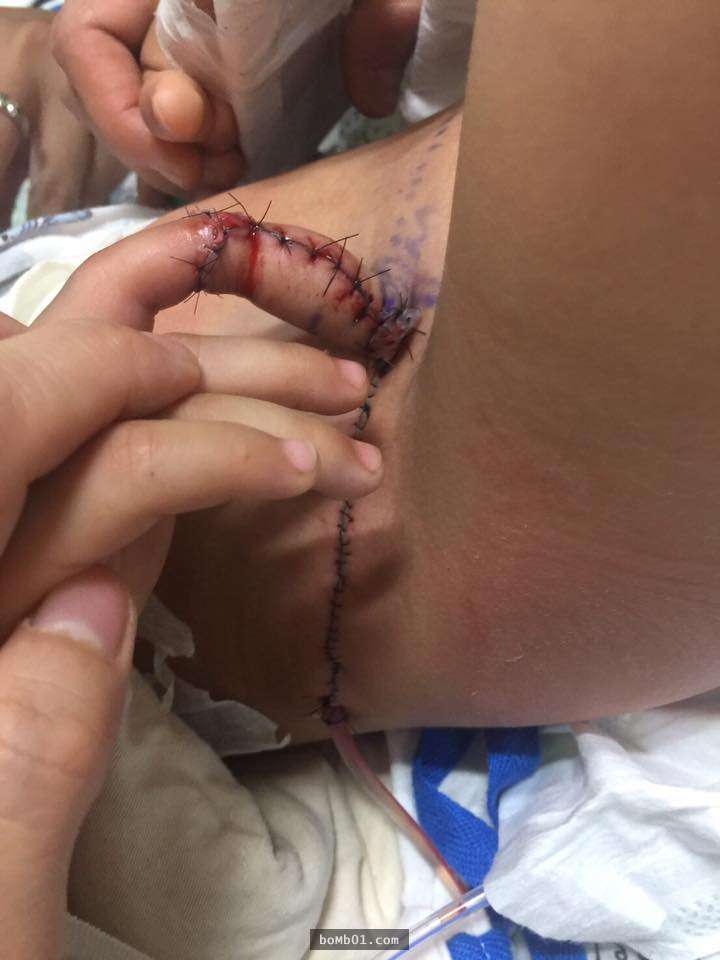 ▼柳媽媽說醫生對她表示,由於馬兒的細菌太多,勉強接回恐怕衍生其他問題,只好先將斷指縫合在肚子上,希望能夠讓斷指長出原本的長度,並儘量保持他以後可以握筆、拿筷子,或是使用右手第一指節;但一切的狀況仍須等到4月初進行皮瓣分離手術後,才能確定斷指的復原狀況如何。
