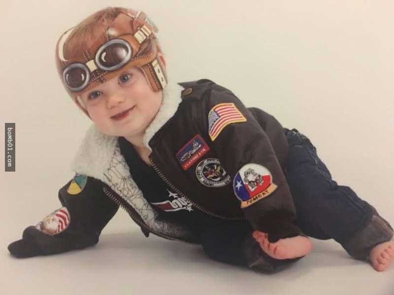 ▼這個可愛的頭盔讓他變成了小小飛行員!