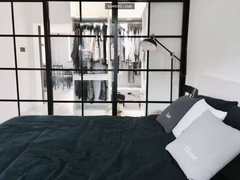 ▼推開木門後就是兩人的主臥,夫妻倆用工業風的頂高玻璃,把裡頭隔成了三重空間。