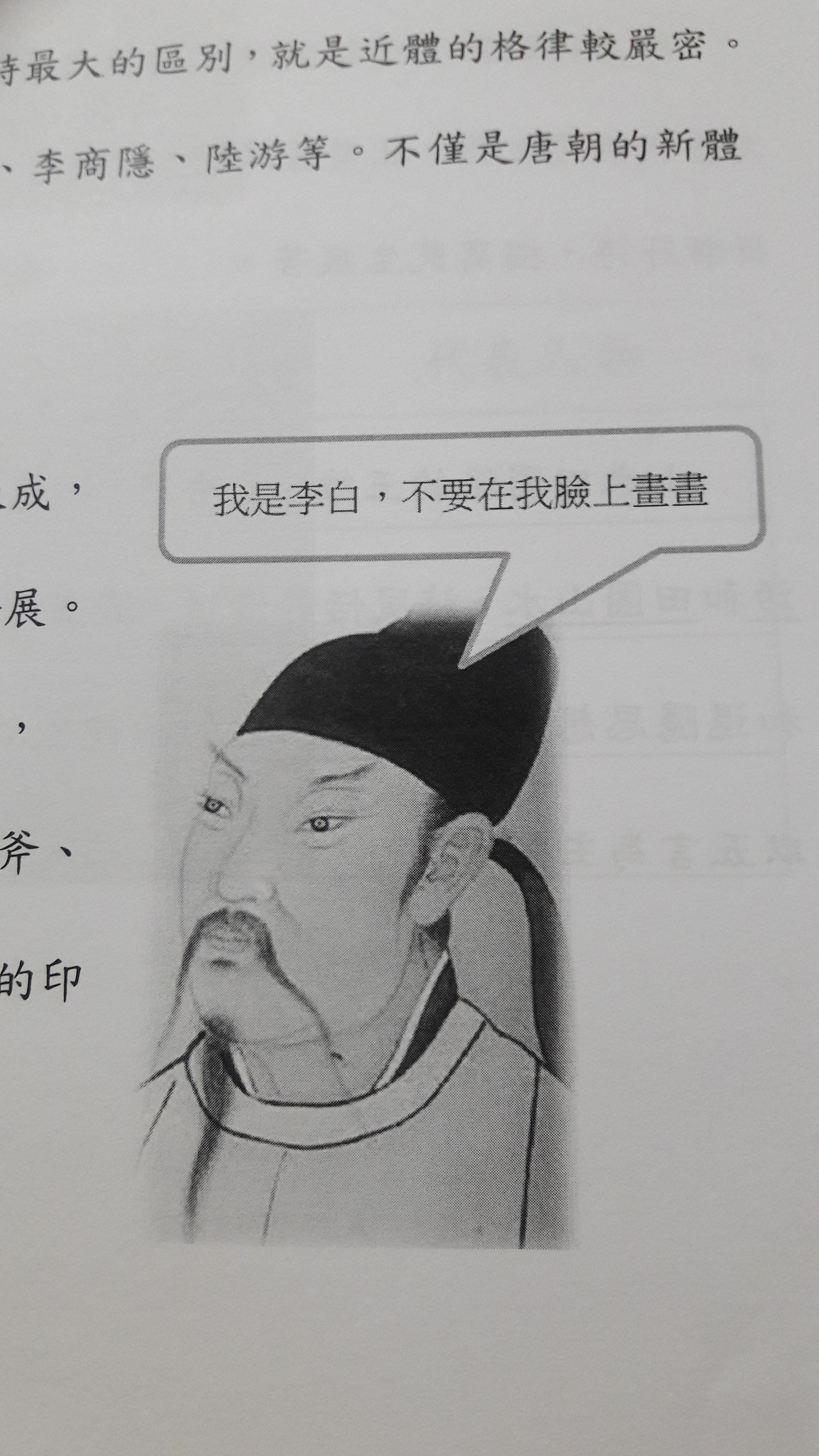 ▼這名網友的妹妹從先修班回來後很開心,神秘兮兮地對她說:「姐,你看我們的講義!」她以為妹妹要自己幫忙檢查錯誤,就拿過來翻看,沒想到一下子打開了新世界的大門。只見熟悉的李白畫像上多了對話框,還寫著:「我是李白,不要在我臉上畫畫。」
