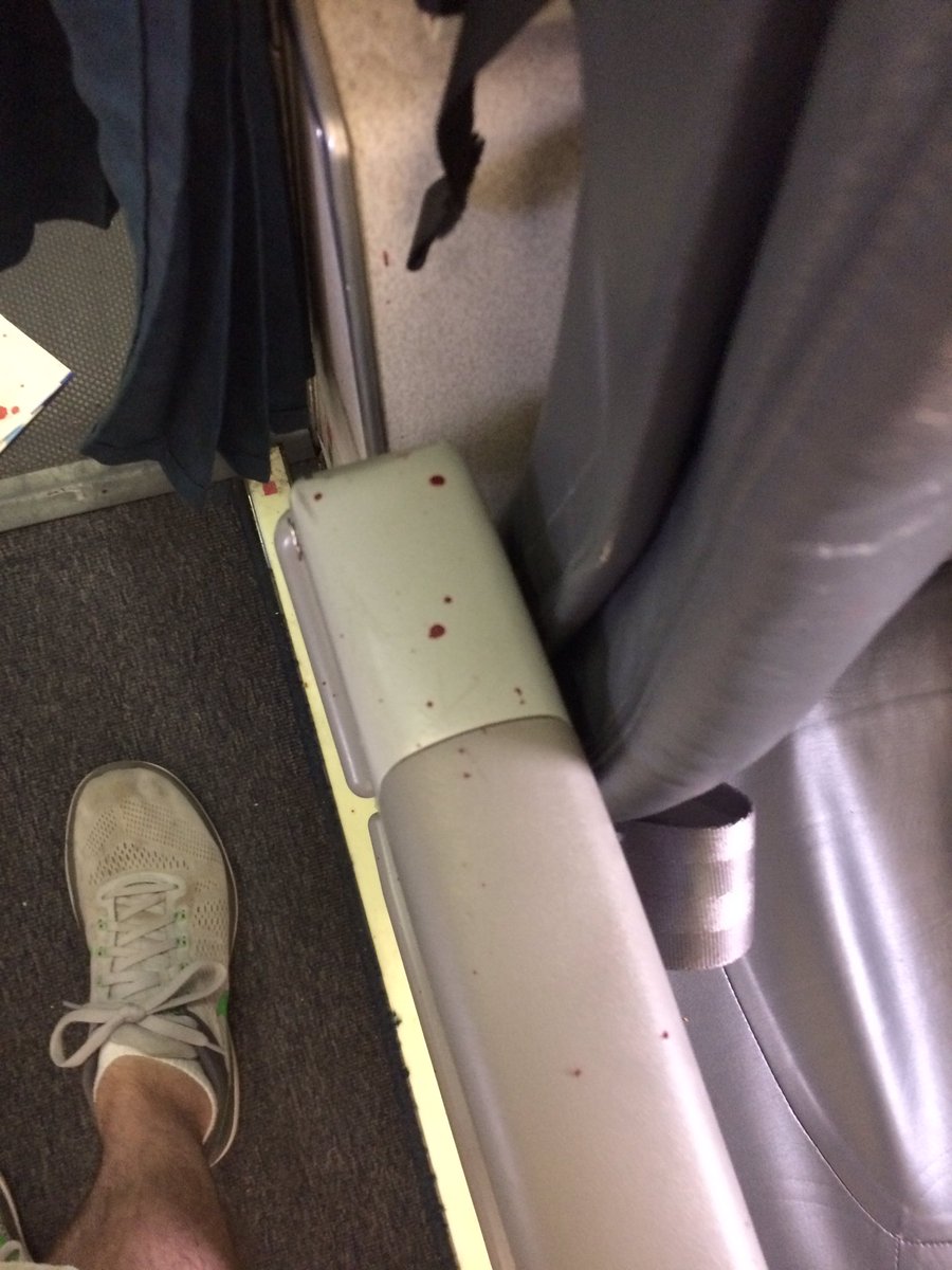▼當時機內人心惶惶,大家都因為這場景驚呆了,有些小孩甚至被嚇得哭出來。最後機組人員請所有乘客都下機,因為他們必須清理血跡。因為這樣班機延誤了三個小時才再度起飛。