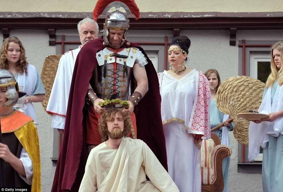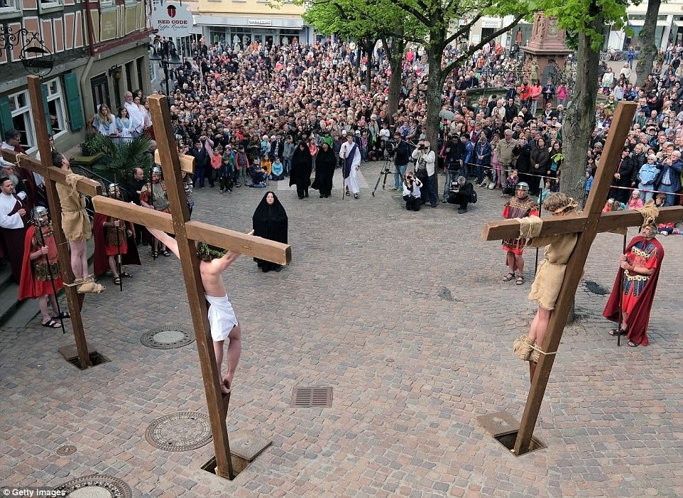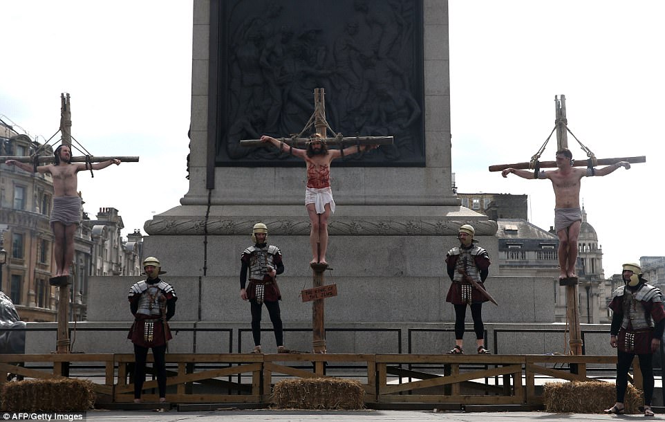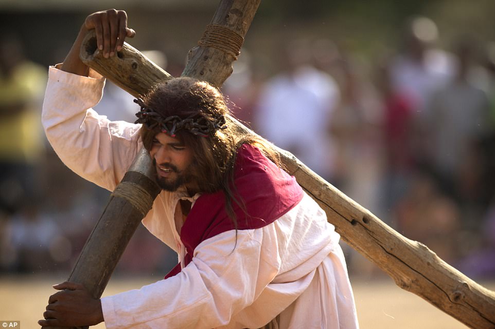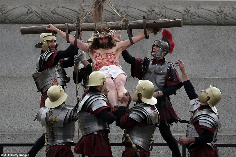 ▼演員Julian Lux扮演耶穌,正在重演受難的一幕。