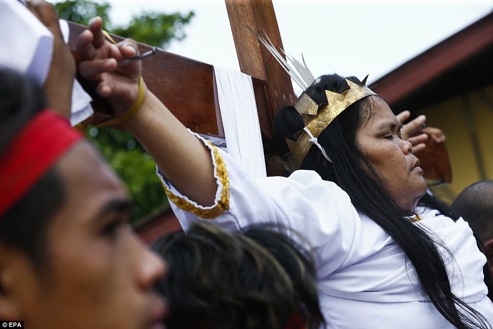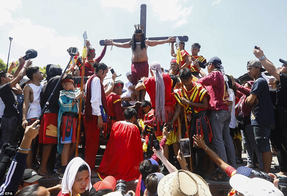 ▼這些人模仿耶穌基督的經歷,被釘在十字架上,還有人圍觀拍照。