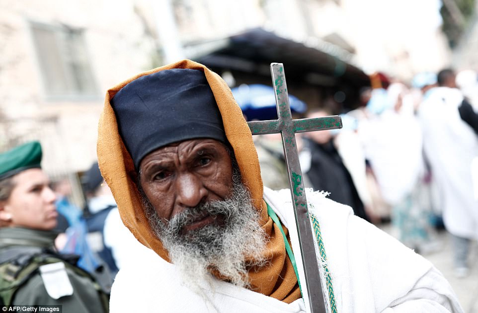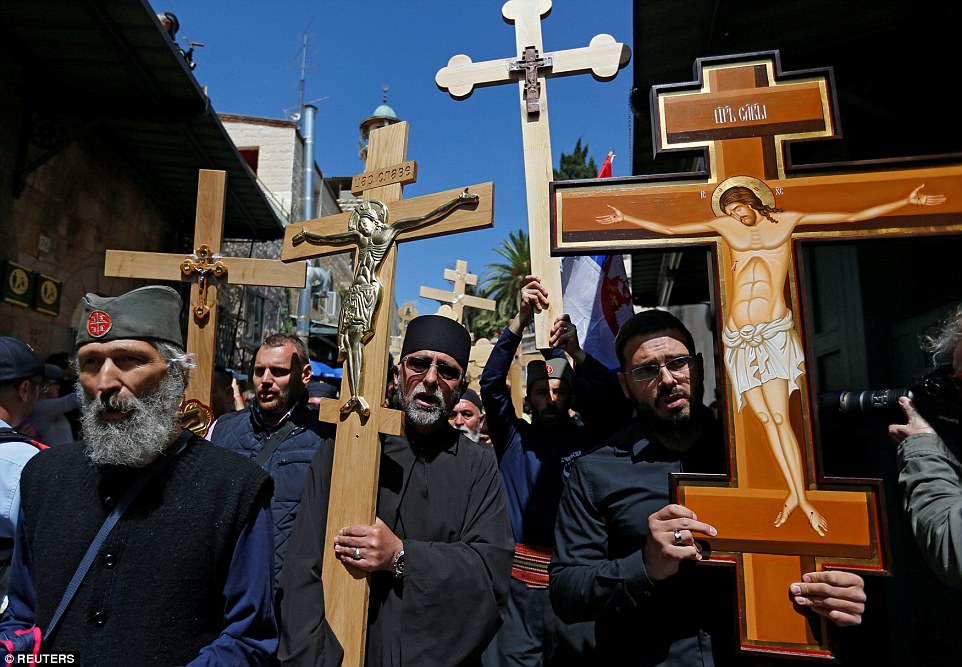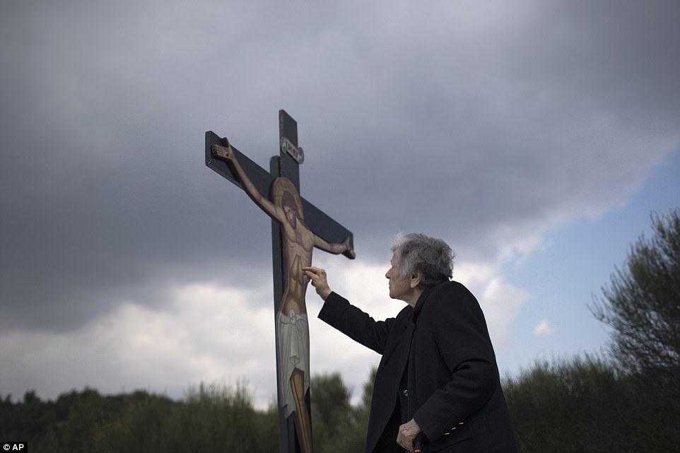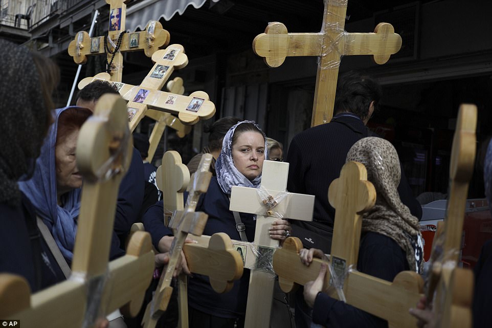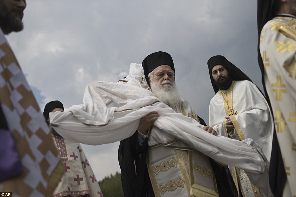 ▼希臘牧師拿著十字架,在1587年建立的修道院附近舉行儀式。