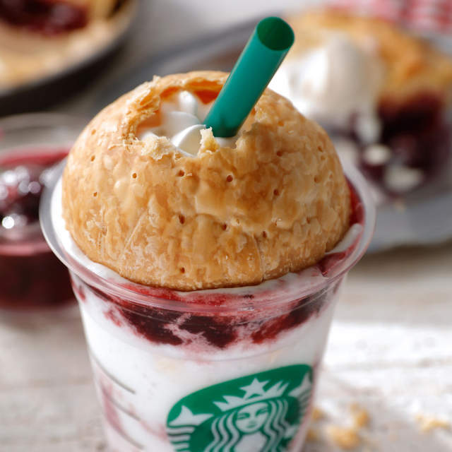 ▼櫻桃派星冰樂的構造跟酥皮濃湯有點像,建議吃法是用吸管插入派皮後搗碎,混在飲料裡面一起喝,想用湯匙直接挖起來吃也可以。在星巴克官網上放的照片一切都看起來很美好,感覺不出來到底有哪裡困難的。