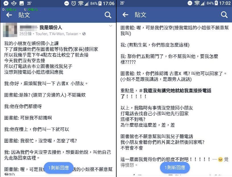 ▼圖書館館員被她盧得受不了,對旁邊的人大喊「認識XXX嗎?叫他可以回家了!」之後就直接掛電話,讓這名母親氣得上臉書發 抱怨文,表示「為什麼態度那麼差!差!差!」。