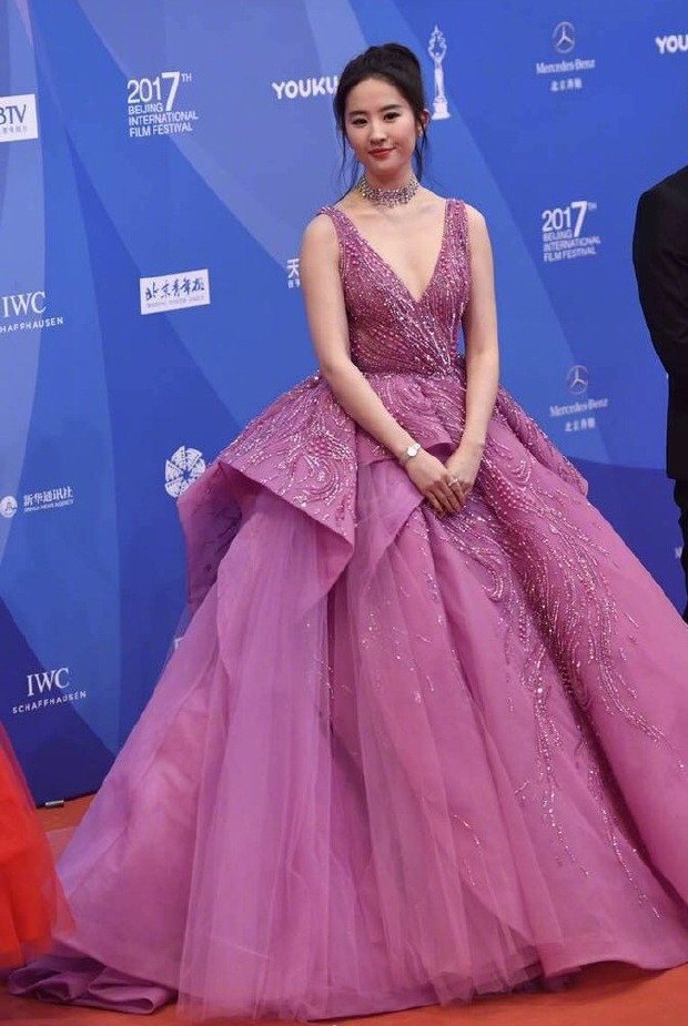 ▼很多女星喜歡穿Zuhair Murad走紅毯,劉亦菲選擇的是紫粉色鑲珠飾的2017春夏系列高級訂製禮服,蓬紗、皺褶等元素非常夢幻,公主氣息十足。不過這款禮服的大V字領口能夠露出雪白酥胸,在青春的少女氣息中加入了點點性感誘惑。