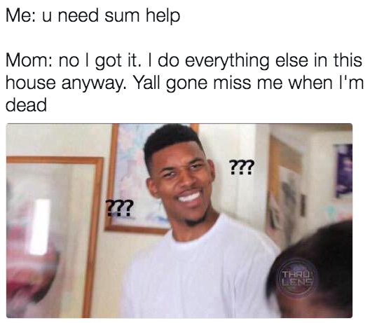 媽媽:「不用,我自己來。反正家裡的事情都是我在做。等我死了你們一定會很想念我!」