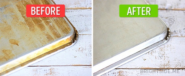 ▼用過的平底鍋和烤盤往往覆蓋著一層難以清除的鍋底灰,小蘇打和過氧化清潔劑很快就會讓你的鍋光潔如新。