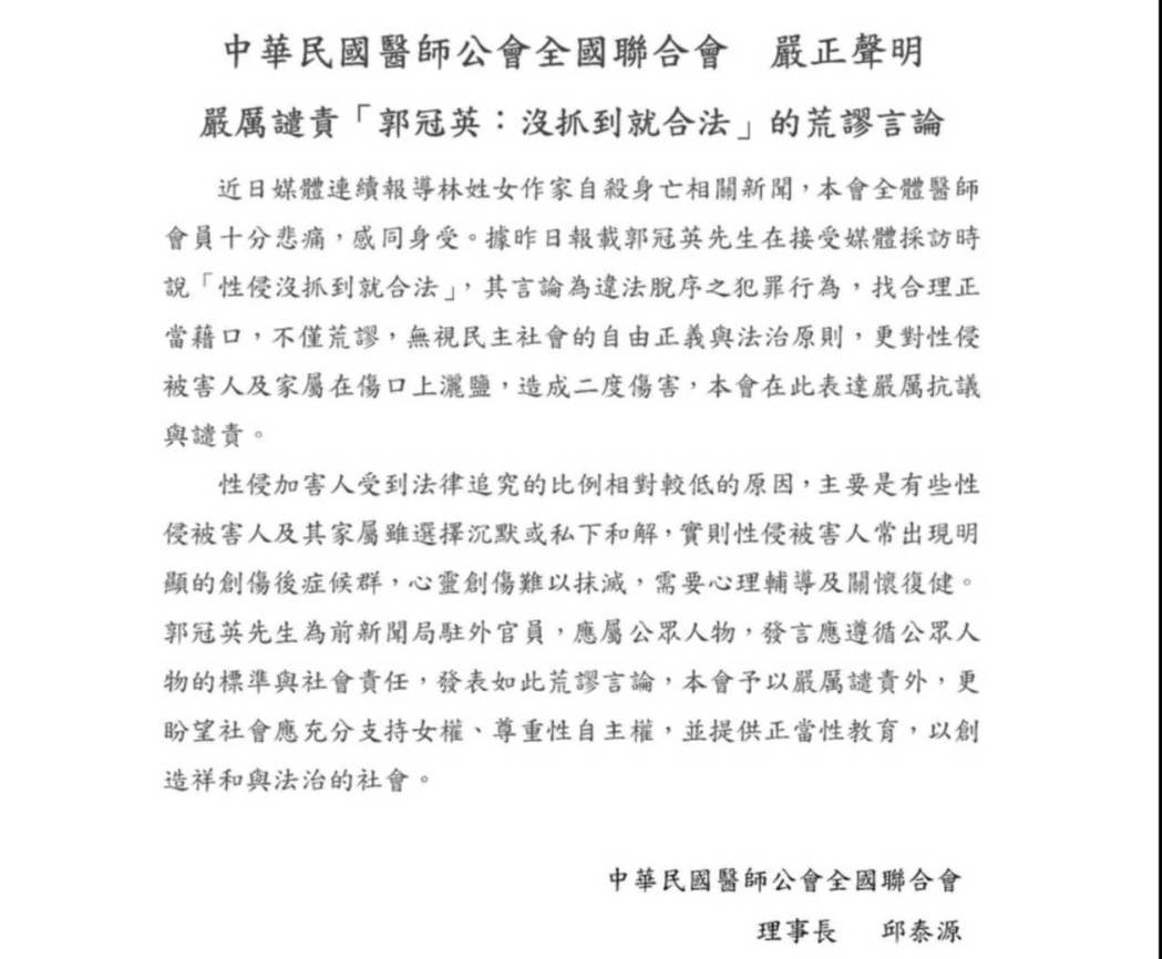 ▼郭冠英此番言論也被醫師公會痛罵,指出他這是「違法脫序之犯罪行為」,無疑是「對性侵被害人及家屬在傷口上灑鹽,造成二度傷害」,必須嚴厲譴責他的行為。