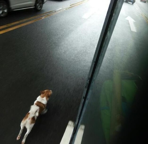▼老人家全程沒說話,只是從車窗對狗狗打手勢,似乎是讓牠不要再追,但狗狗還是跟在後面。就這樣,狗狗追車跑了半個小時,每次公車到站,牠就停在旁邊休息一下,眼睛一眨不眨盯著車門的方向,怕錯過主人下車。公車離站時,牠又繼續跟著跑,就連司機都特意放慢了速度,就怕牠發生危險。
