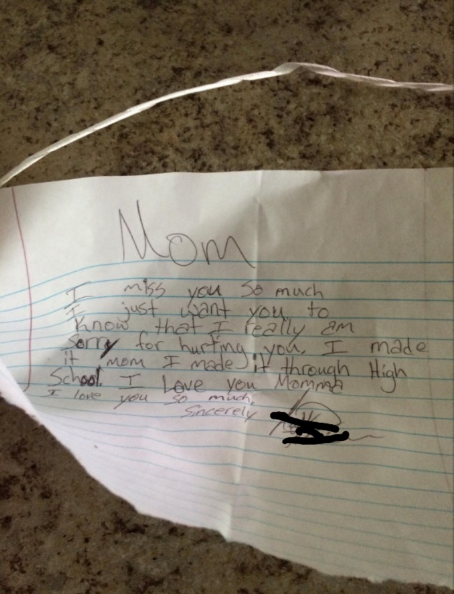▼​12.綁在氣球上的信:「媽媽,我好想你。我希望你知道,我很抱歉傷害了你。我做到了媽媽,我從高中畢業了,我愛你媽媽!」