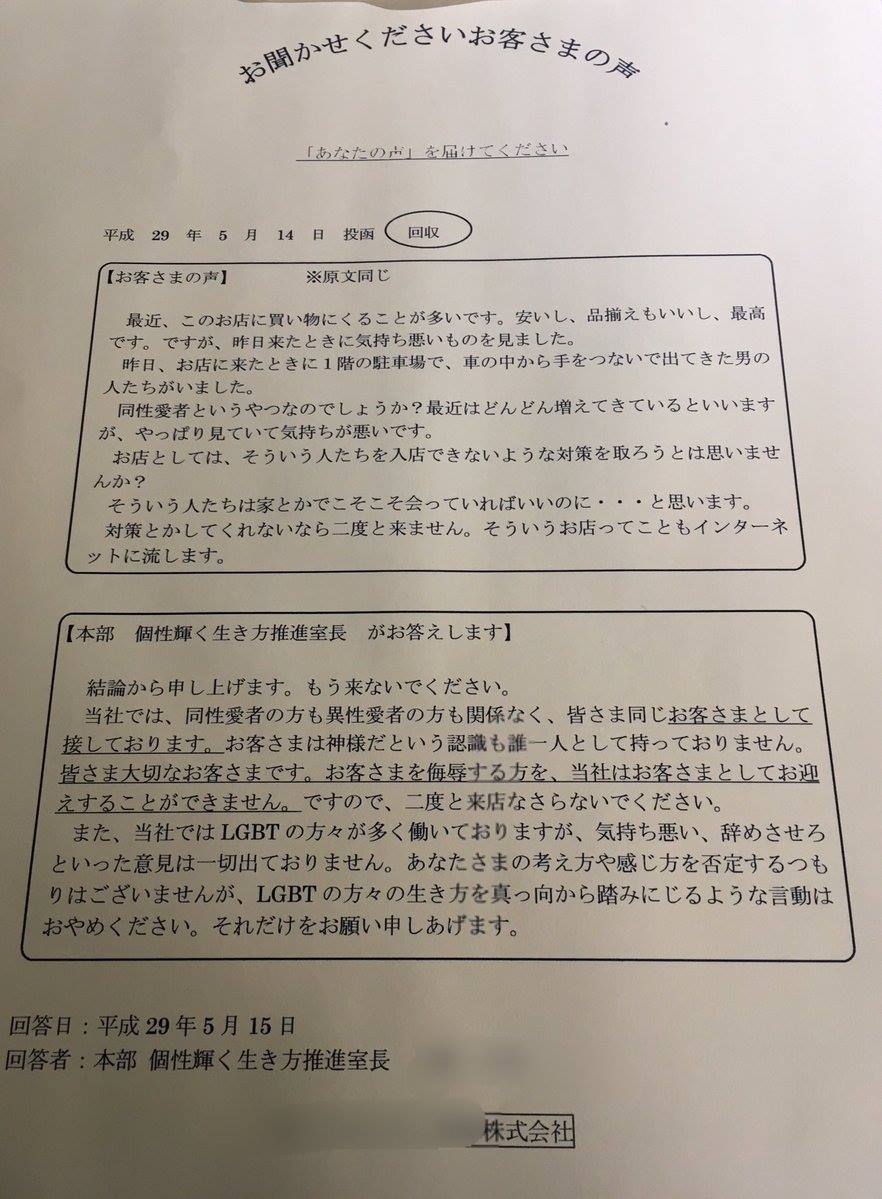常客投訴日本商場「男同性戀顧客很噁心」,總公司直接霸氣回覆「請你以後不要再來了」!