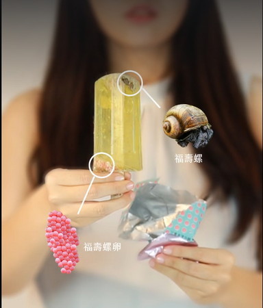 ▼從冰棒裡的「成分」,我們就可以看到它的污染源。例如三重水漾公園的水質內,就充滿了福壽螺。