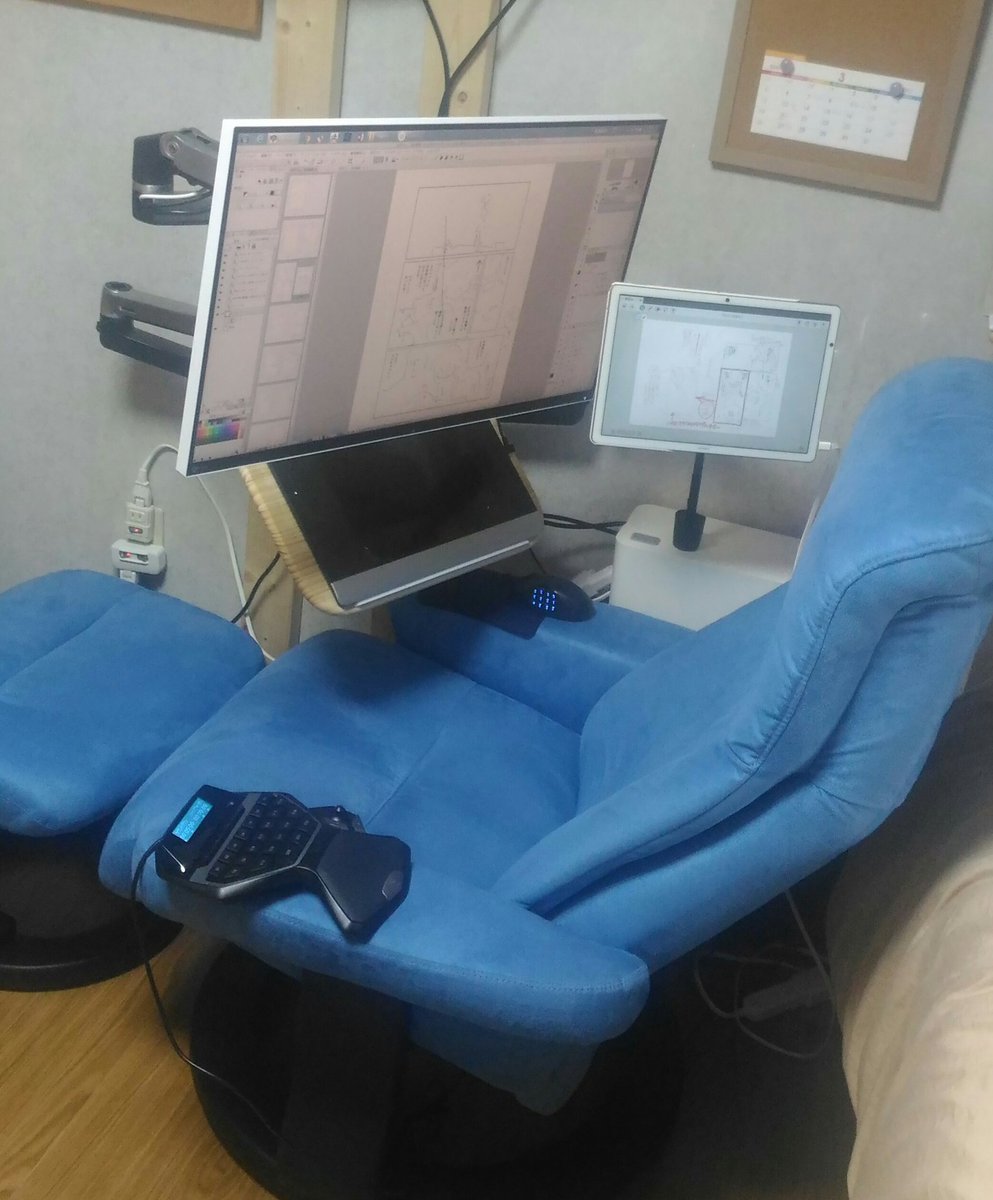 ▼他在兩個月前於自己的推特上公布了自己改造的工作桌,舒服的椅子配上電腦熒幕,讓他可以用最舒服的坐姿長時間作畫。