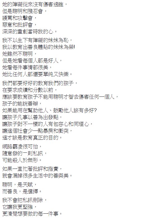 網路上真的什麼敗類都有,就算你不認同這名老師的做法,也不需要用她小孩天生的缺陷去攻擊她,這樣難道你會得到什麼好處嗎?網路發言雖然匿名,可是該有的禮儀還是要有,怎樣都不應該這樣口無遮攔!