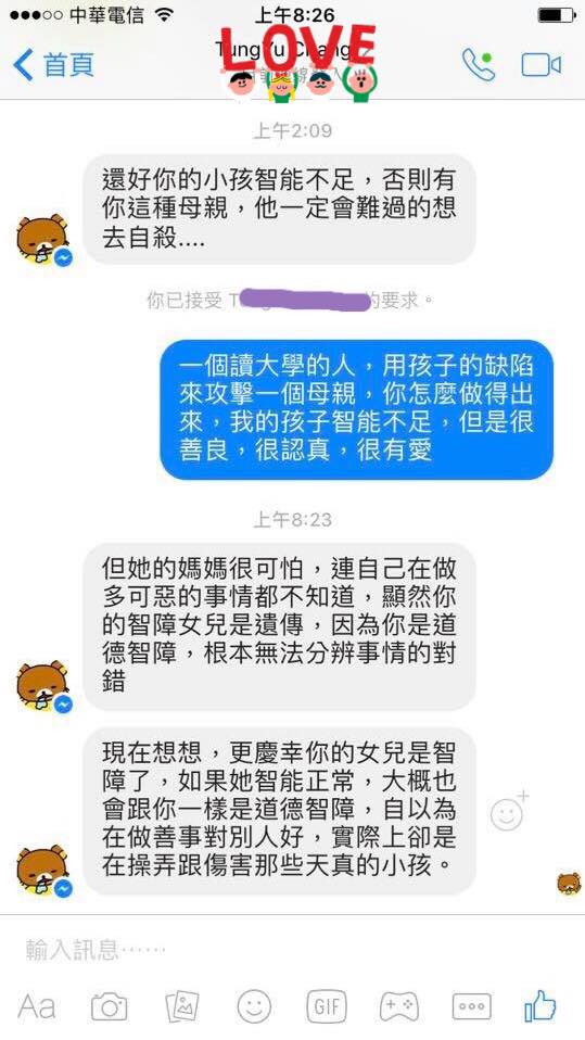 ▼原來有一名毒蛇網友用臉書私訊她,寫道:「還好你的小孩智能不足,否則有你這種母親,他一定會難過得想去自殺」。雖然老師大氣地回應:「一個讀大學的人,用孩子的缺陷來攻擊一個母親,你怎麼做得出來,我的孩子智能不足,但是很善良,很認真,很有愛」,沒想到網友竟然還不放棄攻擊她,繼續寫出許多難聽的話,還表示「顯然你的智障女兒是遺傳」這種難聽的話!
