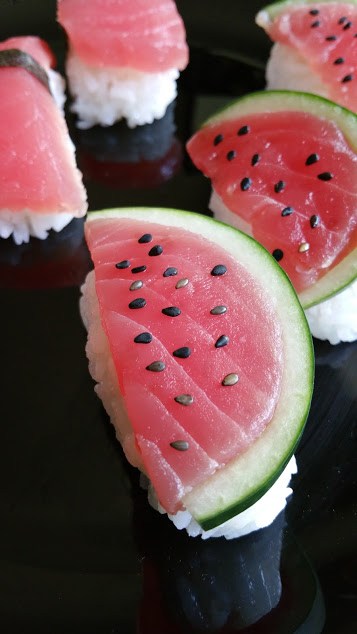 ▼鮪魚與西瓜真的滿像的,用鮪魚假扮西瓜,再撒上點芝麻,看起來也毫無違和感呢。