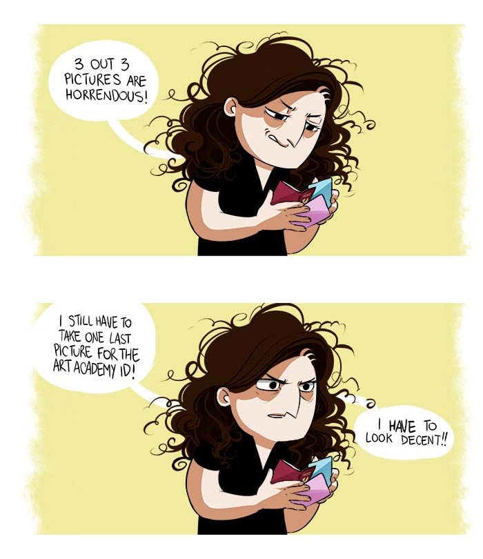 ▼「3張照片裡有3張都恐怖死了!」、「我一定得再拍一張新的大頭照,藝術學院要用!」、「我必須看起來美呆了!」
