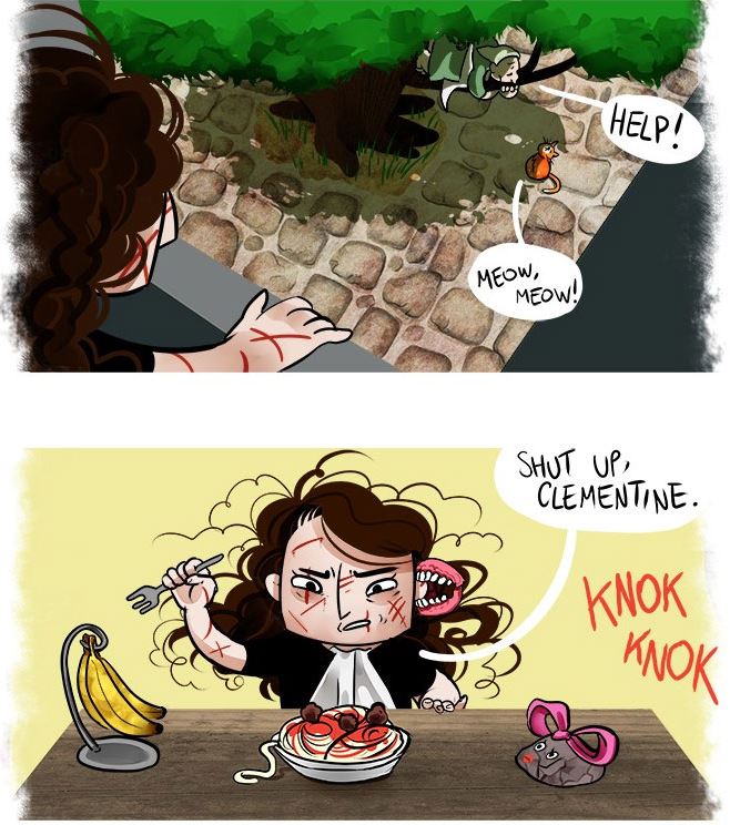 (回到餐桌)「嘿,橘子(寵物石名)走開,你不能吃我的義大利麵…」