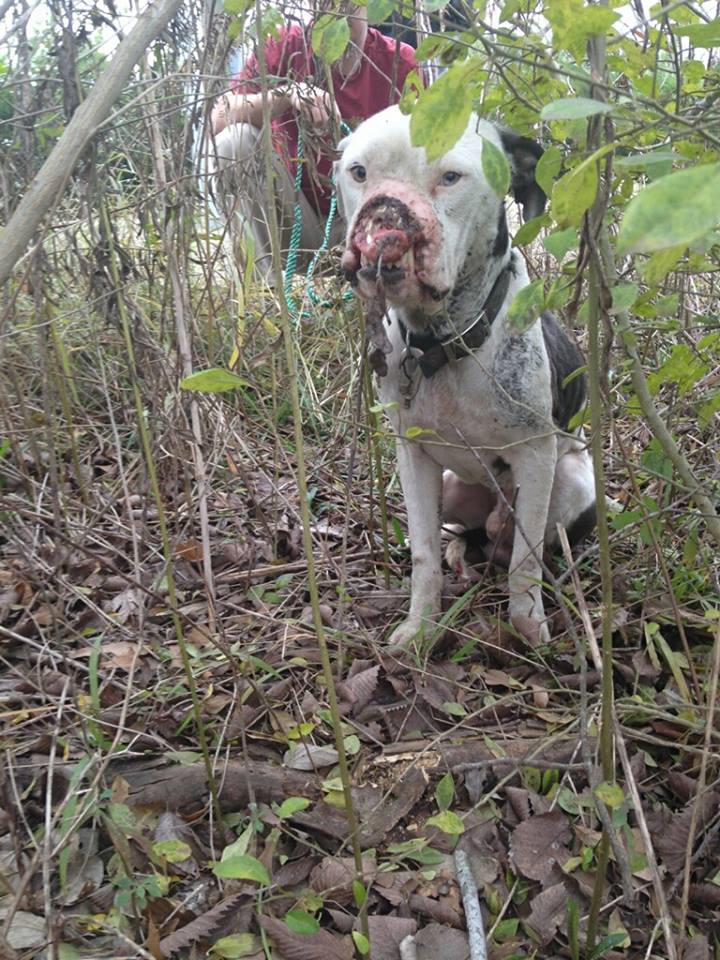 ▼那天有人打電話說建築垃圾場附近有一隻流浪狗,好像受傷了。她連忙趕到那裡,在垃圾遍地的灌木叢中看到了Apollo。Apollo是一隻比特犬,牠的臉受傷了,傷口深可見骨,因為沒有及時救治,已經腐爛發臭。