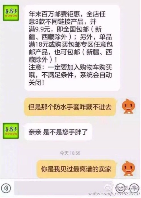 2017年07月06日常在網路上買東西的大家,一定都會有跟賣家客服交流的經驗,這些網拍客服有些是店主自己兼任,也有一些是另外聘請來的員工。中國的網路經濟十分蓬勃,擁有數不盡的賣家就一定也有數不盡的客服,人多質素就一定會參差不齊,詢問他們問題時有時候會得到一些讓人啼笑皆非的回覆,來看看他們是怎麼回覆的吧: