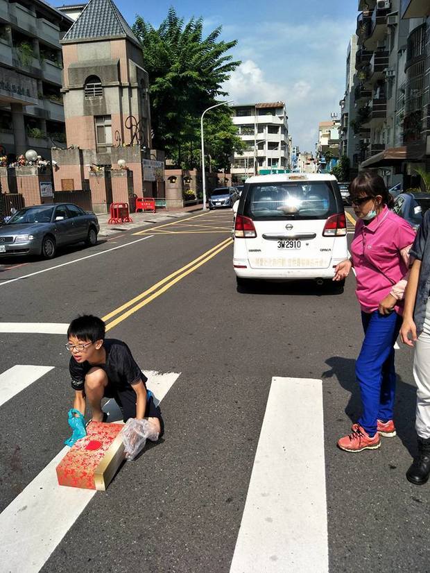 ▼在嘉義市成功街與西榮街T字路口上,一隻浪貓慘遭撞死,結果路過的程姓國中生默默找出紙盒,替貓貓收屍。