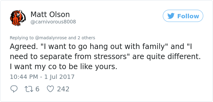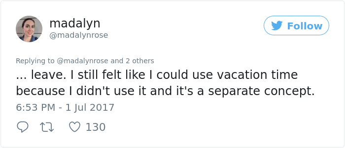 ▼Madalyn非常驚訝。眾所周知,上班族生活節奏太快,很容易出現精神壓力,職場上的心理健康問題一直沒有被重視,用這樣的理由請假,很多老闆會不屑一顧,甚至覺得你是在為偷懶找藉口。Madalyn的老闆卻鼓勵她用病假天數休息,她非常感動,忍不住將這件事分享到了網路上。